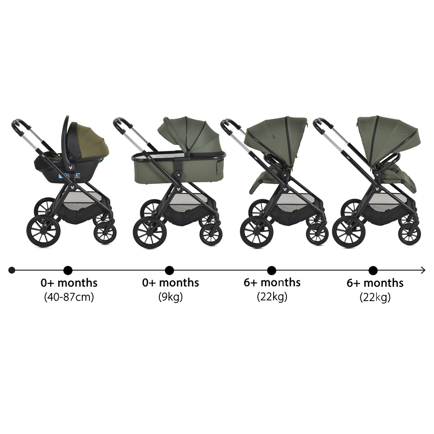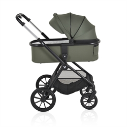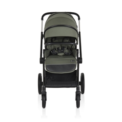 Det komplette sæt inkluderer et stel, barnevogn, vendbart sæde, i-SIZE autostol (40-87 cm) og praktisk tilbehør