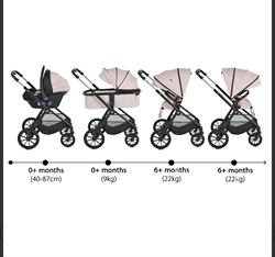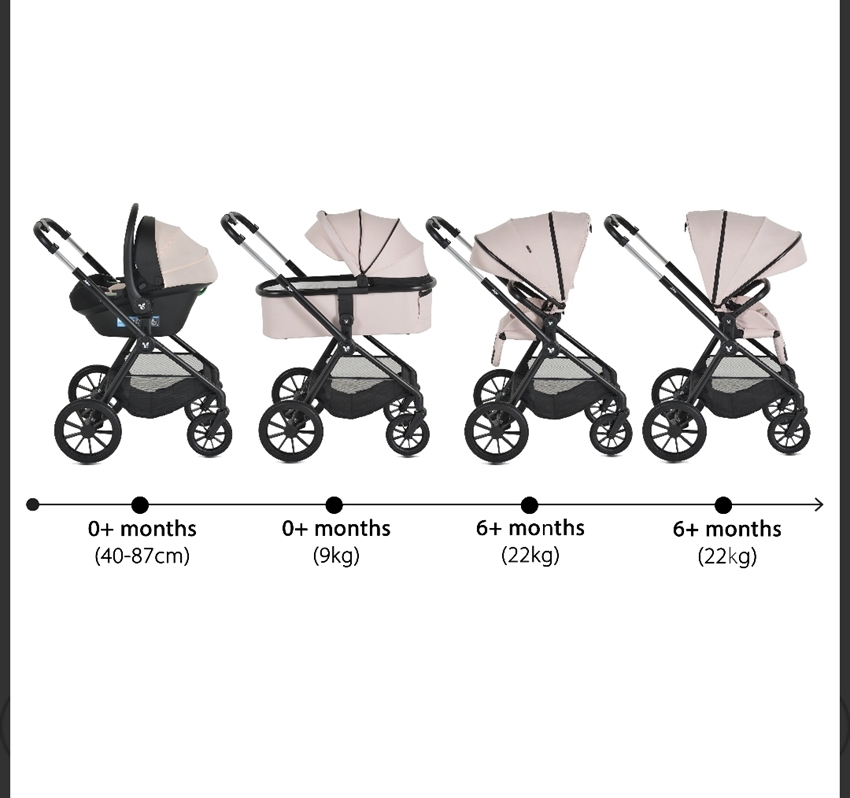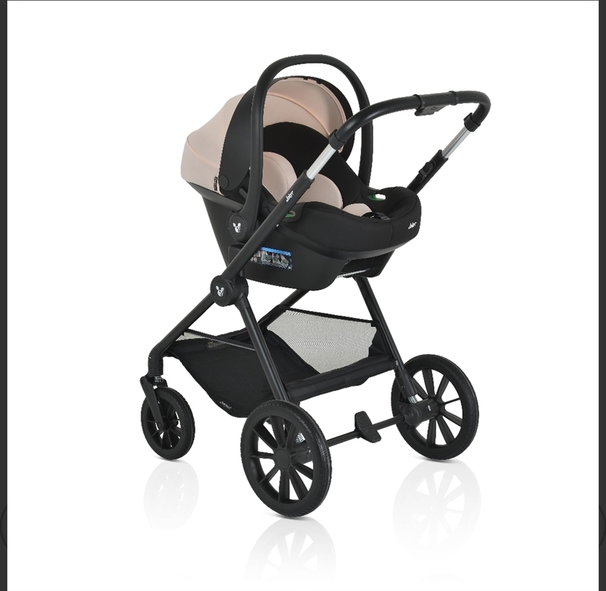 Det komplette sæt inkluderer et stel, barnevogn, vendbart sæde, i-SIZE autostol (40-87 cm) og praktisk tilbehør