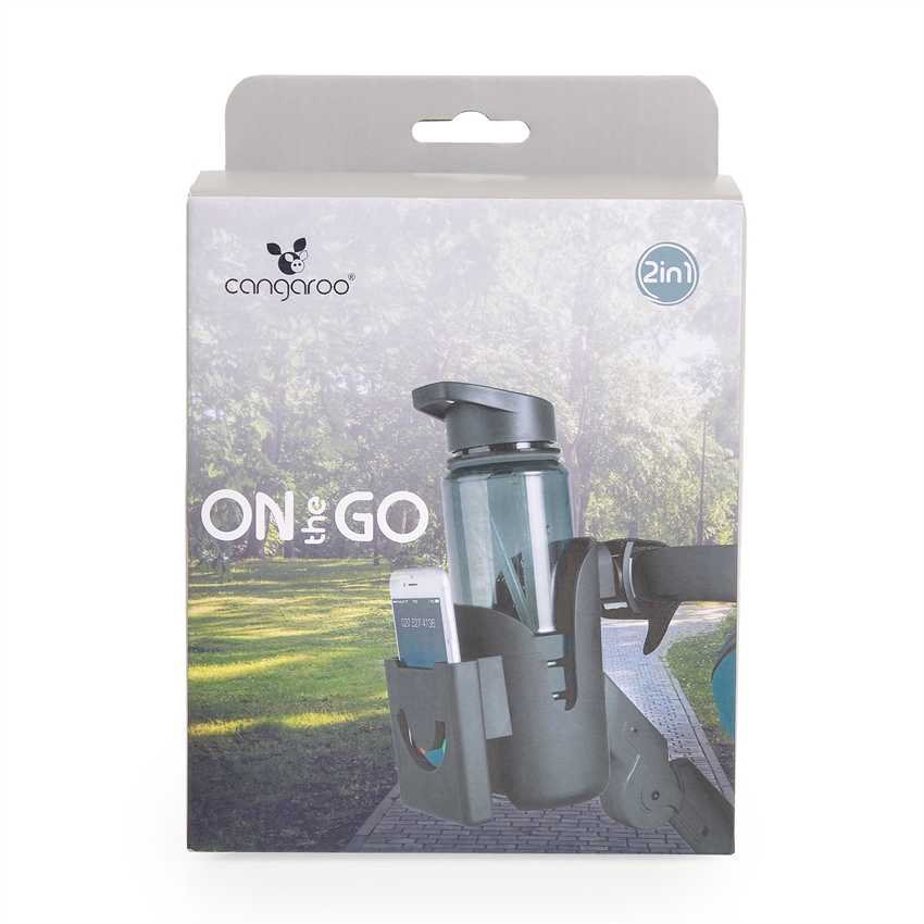 Denne praktiske kopholder har rum til en sutteflaske, almindelig flaske eller en To-go kop og telefon, hvilket giver bekvemmelighed og nem adgang til vigtige ting under gåture.